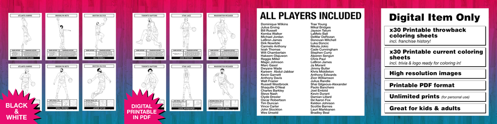 Activity Sheet for adults and children. This includes, trivia, player and logo coloring-in sections, fun facts and team/franchise history. Learn about how your team originated, their name changes and where their name originated! There are 60 total pages, 30 legends (including team history) and 30 all stars (including trivia about their team and 2 franchise logos to color-in!), that means there are 2 pages for each team! 🏀